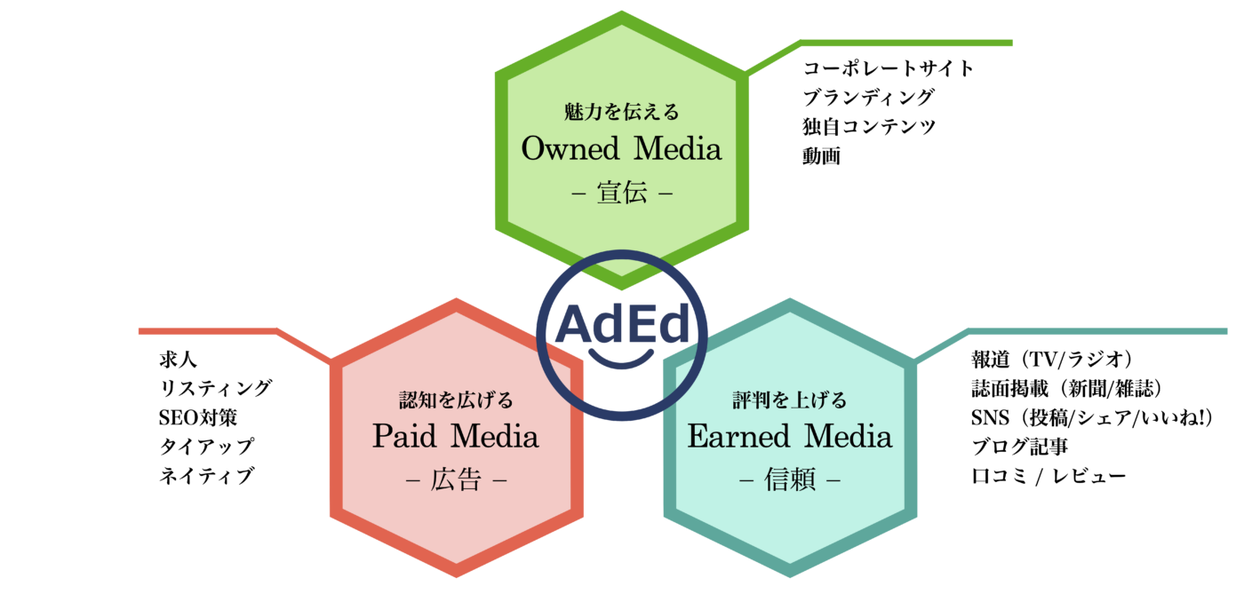 トリプルメディア戦略に基づき、Paid Media、Owned Media、Earned Mediaを利用した企業認知向上、採用マーケティングの企画設計や運用支援などを行う。HRMの観点から、採用だけにとどまらず定着までを意識した上で、広告効果を見える化。短期×長期の2軸で考え、目の前の人手不足を改善しつつも先々人で困らないような施策提案を行う。